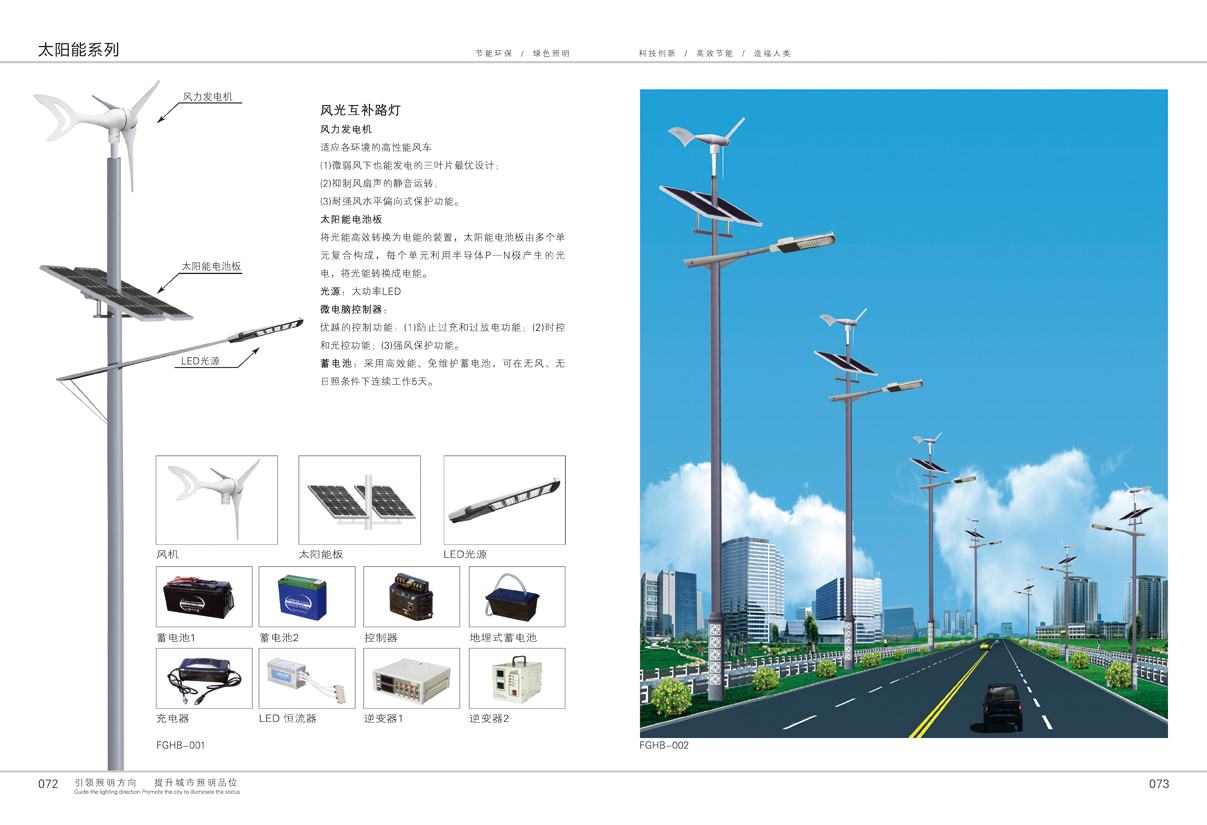 本产品无需铺设地下线缆(也可采用市电直接照明),无需支付照明电费,太阳能路灯所采用的关键部件太阳能电池板、太阳能直流路灯智能控制器、免维护蓄电池、照明灯具均经过国家发改委/GEF/世界银行光伏产品认证。